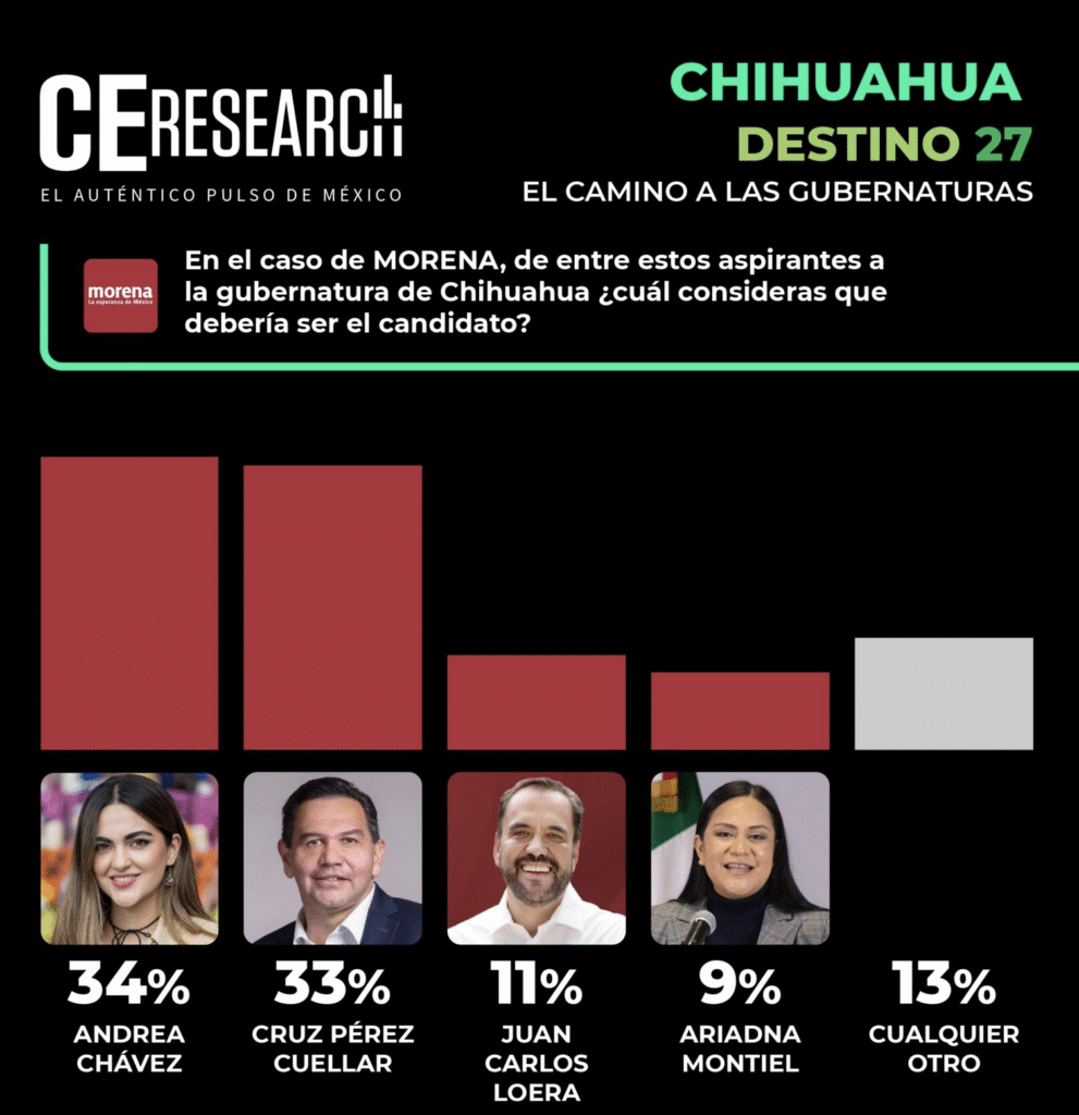 Al interior de Morena, el ejercicio estadístico revela que la senadora juarense Andrea Chávez triunfaría sobre el alcalde fronterizo Cruz Pérez Cuéllar por un punto: Chávez obtuvo 34% de las preferencias contra 33% de Pérez Cuéllar, el senador Juan Carlos Loera 11% y la Secretaria del Bienestar del gobierno de Claudia Sheinbaum Ariadna Montiel 9% siendo superados estos últimos por la opción «cualquier otro» con 13%.