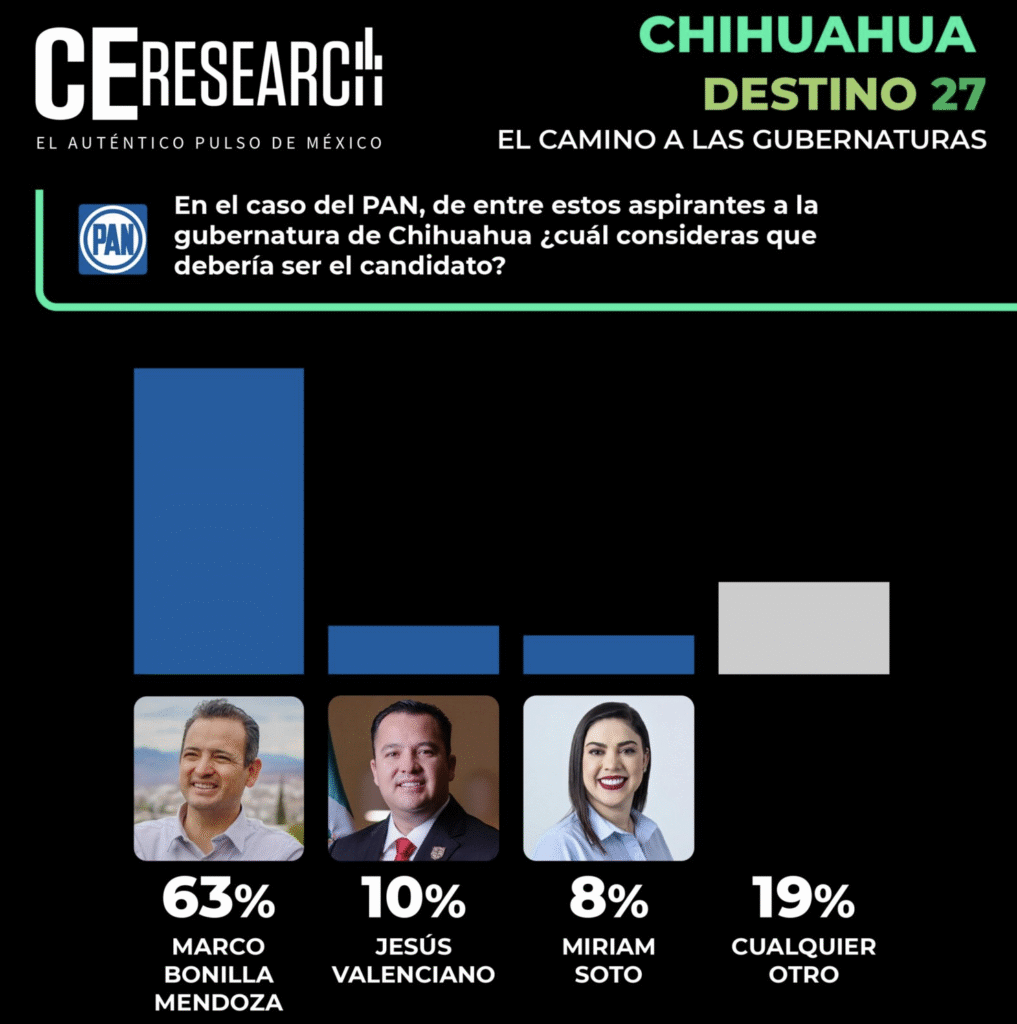El panista alcalde de la ciudad de Chihuahua Marco Bonilla lidera las preferencias de manera abrumadora con el 63% de las respuestas, seguido por el presidente municipal de Delicias Jesús Valenciano con 10% y la alcaldesa del municipio de Meoqui Miriam Soto con 8% siendo ambos superados por la opción «cualquier otro» que obtuvo 19%.