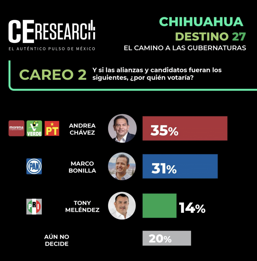 Ciudad de México.- CE Research es la agencia de investigación de la revista Campaigns & Elections México quien realizó una encuesta robotizada vía telefónica el pasado 5 de octubre la cual tiene hallazgos interesantes para quienes están atentos al próximo proceso electoral del año 2027 en el estado de Chihuahua en el cual estará en juego la gubernatura que hoy ocupa la panista Maru Campos Galván.